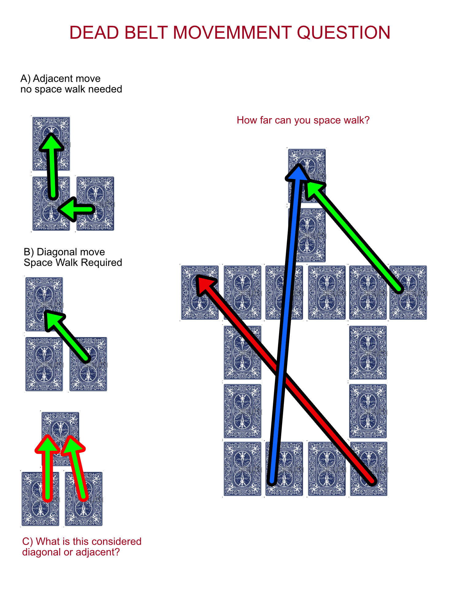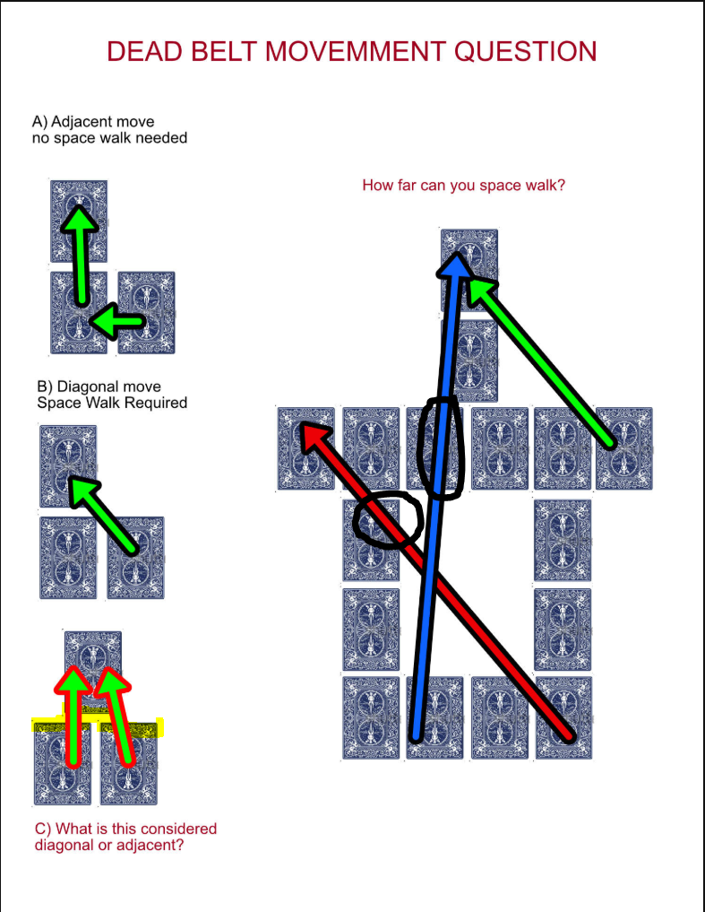 I've highlighted the overlapping short sides of the cards in the bottom diagram. That's an adjacent move. The B diagram shows a move between two cards where the corners are the only bits touching; no overlap on the short or long sides. That'd be a diagonal move.